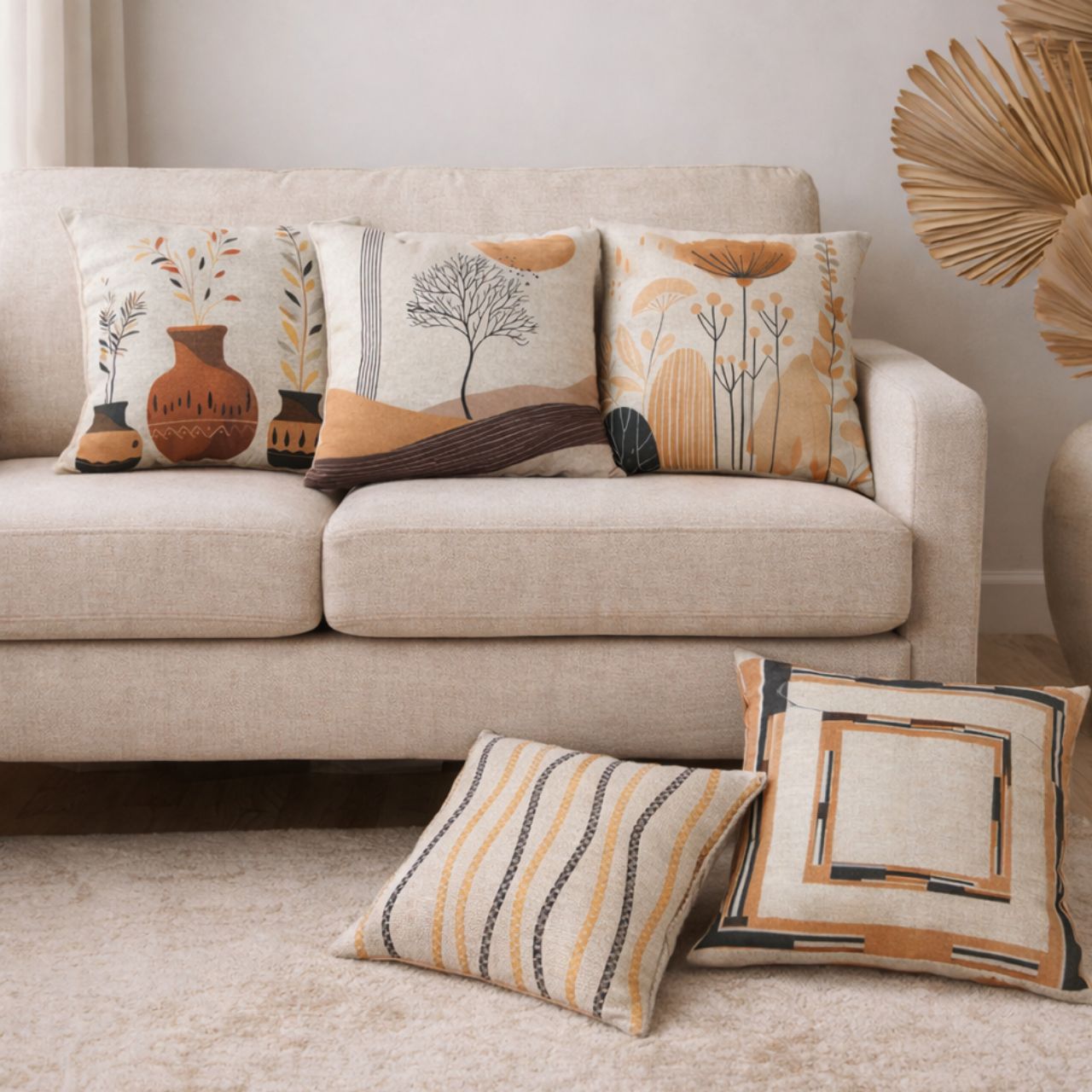 Capa de Almofada em Linho Misto 45x45cm – Estampas Florais Abstratas em tons Amarelo, Cinza, Terracota, Marrom.