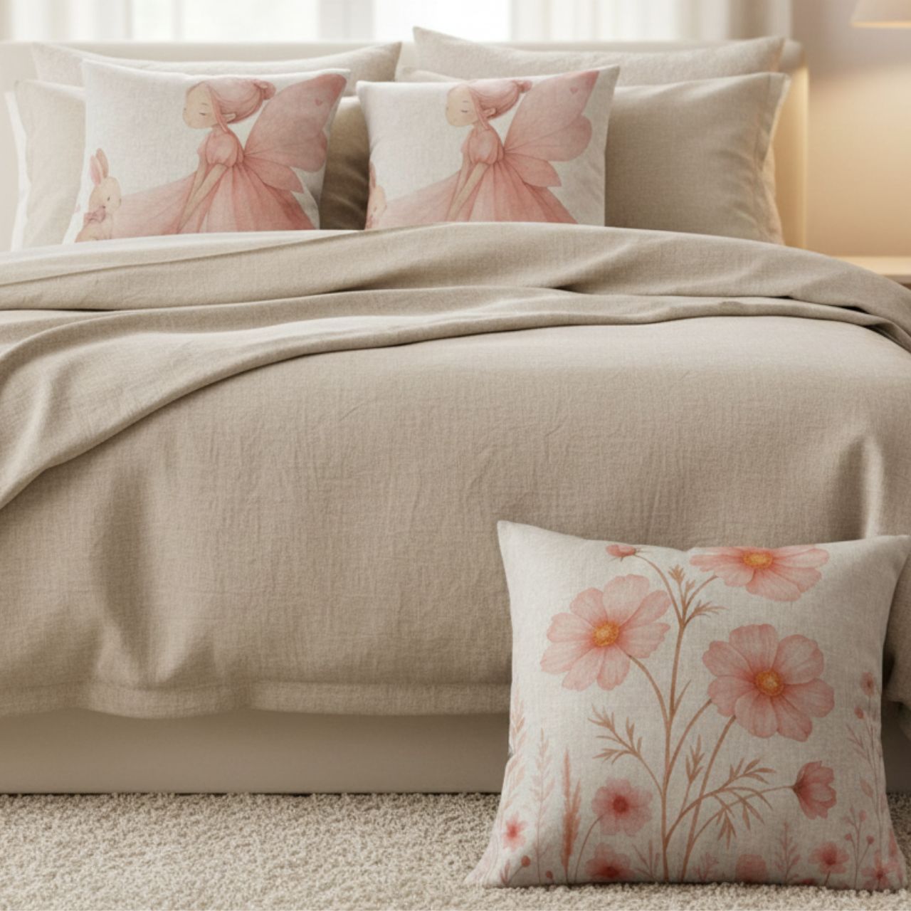 Transforme sua decoração com charme e delicadeza! Nossa capa de almofada em linho misto de alta qualidade traz um toque mágico para qualquer ambiente, com estampas lúdicas de fadas que encantam e despertam a imaginação.