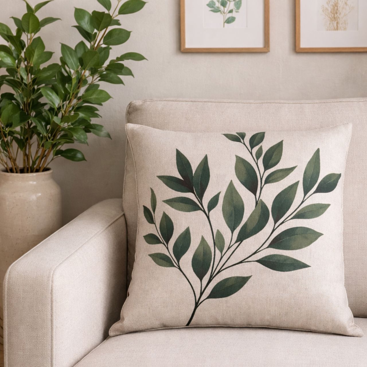 Capa de Almofada decorativa Linho Estampa Folhagens Verde. Sofisticada Decoração Sala Recepção Ambiente Interno Elegância