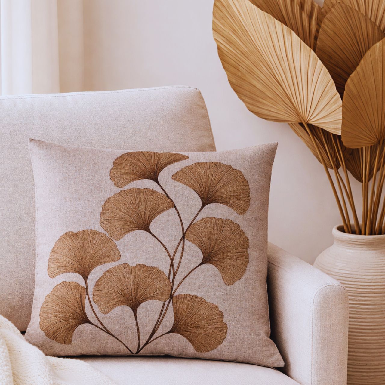 Capa de Almofada decorativa Linho Estampa Ramos e Folhagens Terracota. Sofisticada Decoração Sala Recepção Ambiente Interno Elegância