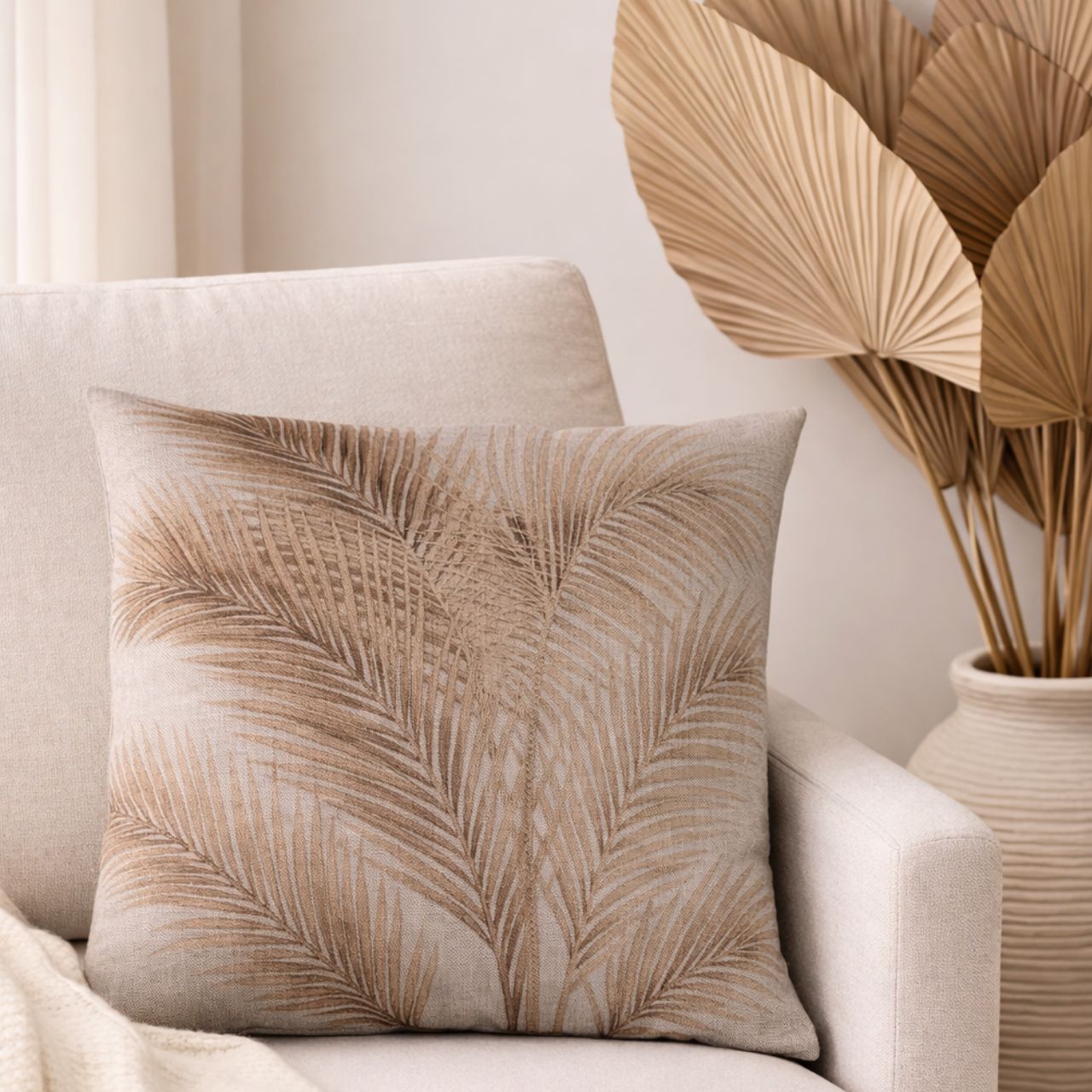 CAPA DE ALMOFADA LINHO FOLHAS RAMOS TERRACOTA 45X45CM