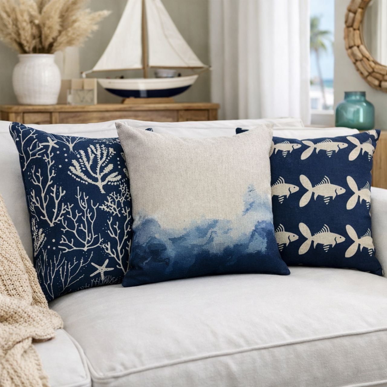Capas de Almofadas em linho misto com inspiração no estilo marítimo são perfeitas para trazer frescor e aconchego ao ambiente. O linho, por ser um tecido natural, transmite leveza e sofisticação, enquanto a temática do mar adiciona um toque relaxante e elegante à decoração, perfeita para compor com estilo salas e ambientes externos.
